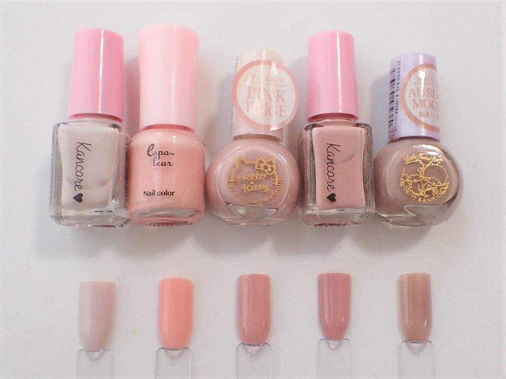 右端がオーロラモカです。オフィスと言えばピンクかベージュですが、最近はグレージュやモカ等、ややくすみ系のニュアンスカラーが多く出ていますね。やわらかい雰囲気を持ちつつトレンド感もあり、そしてこのオーロラモカに関してはマットではなく適度な透明感もあり、どんなカラーとも相性が良いのでとってもおススメです。