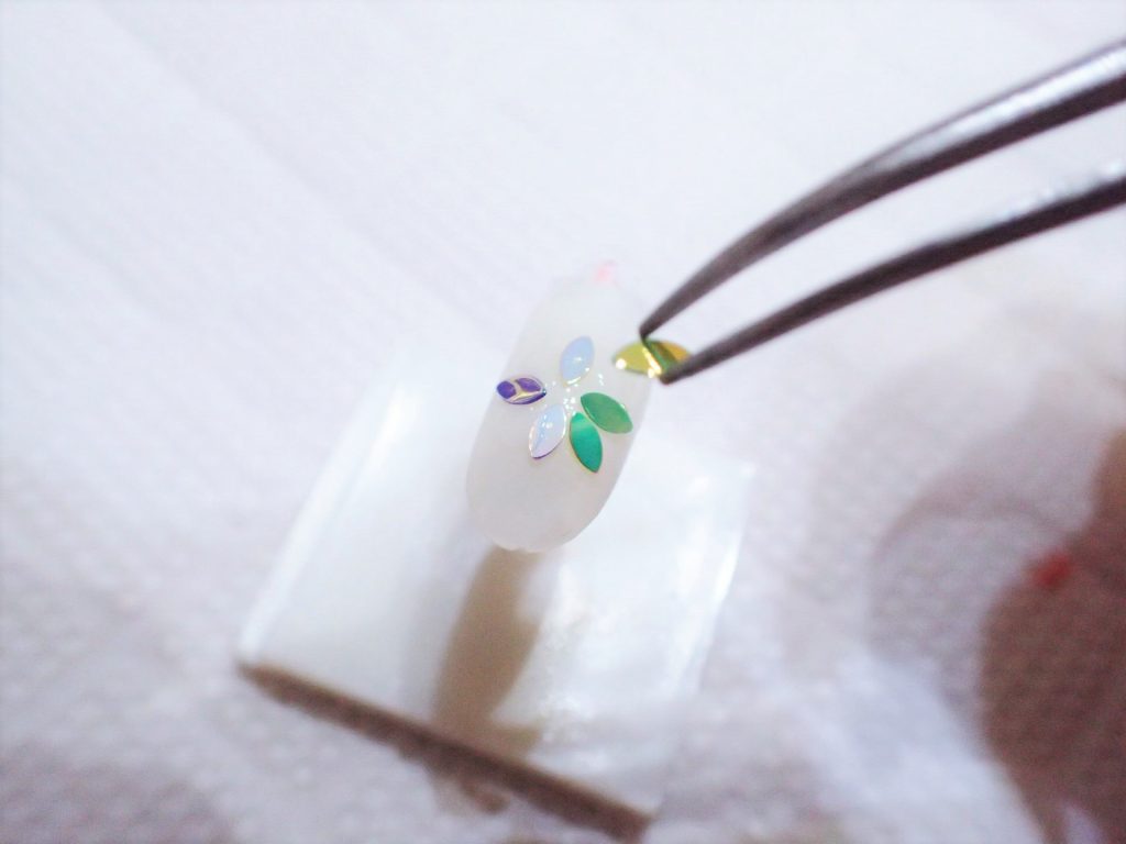 最仕上げにネイルパーツシールを貼りますが、ベースカラーまたはベースアートが乾いてから貼る方が失敗しません。乾いていないとシールがよれてしまったりめくれてしまったりするので、少し時間をあけるのがおススメです。