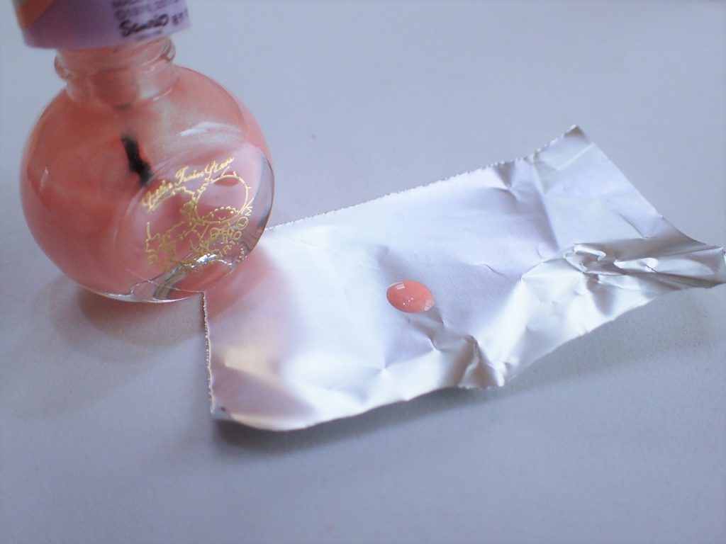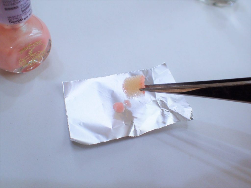 すぐにスポンジをピンセットでつまみ、オーロラピンクを少し付けます。